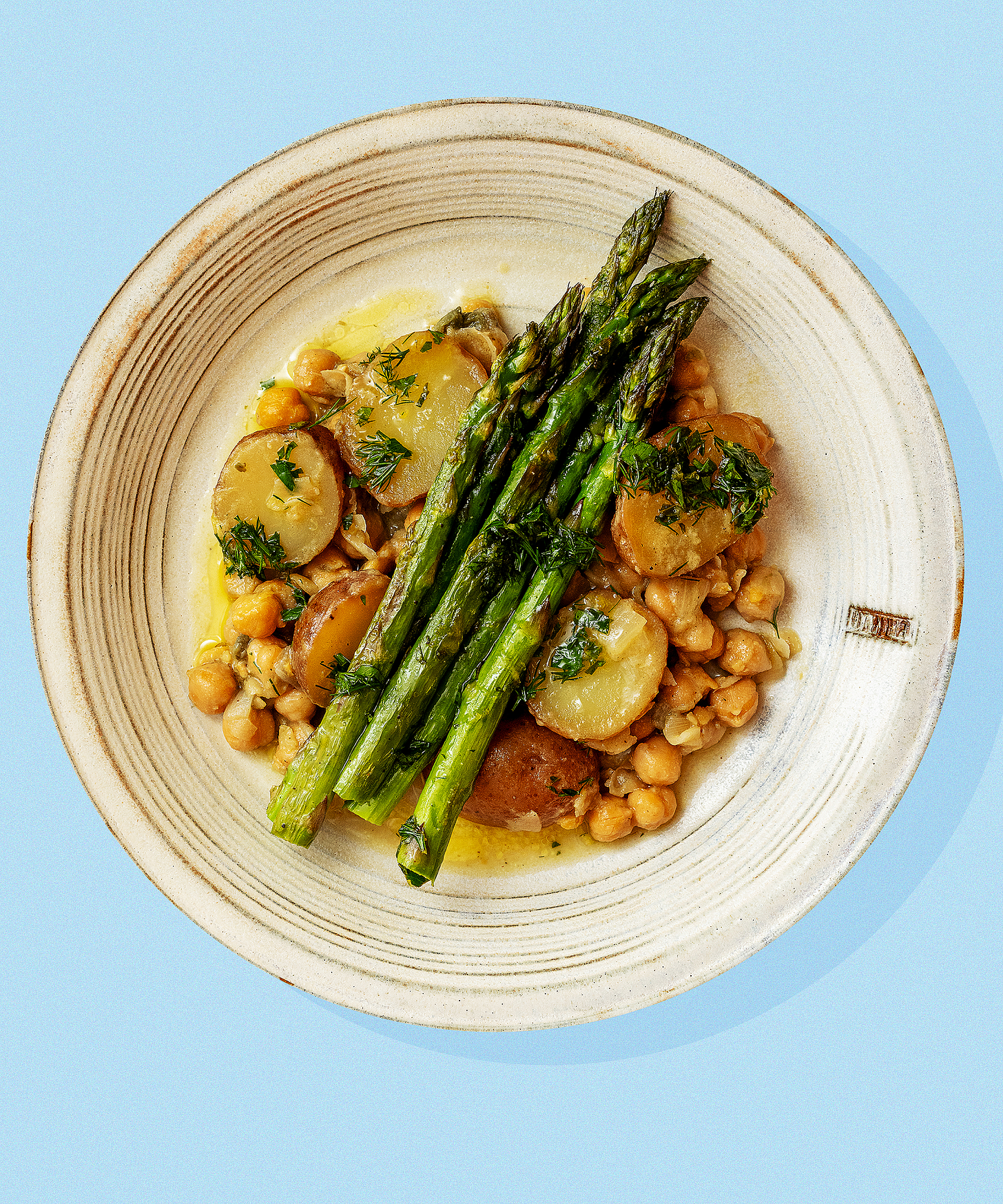 This is a really wonderful springtime comfort dinner. Roasted asparagus adorns a thick, stew of mustardy chickpeas and potatoes. It’s finished with a bright, zingy lemon-dill sauce that perfectly ties everything together.