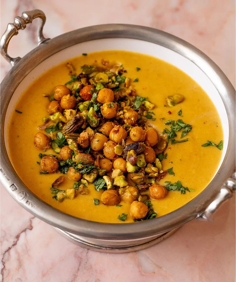 A fiery, flavorful vegan butternut squash soup is topped with crispy pistachios and chickpeas for the ultimate comfort meal.
