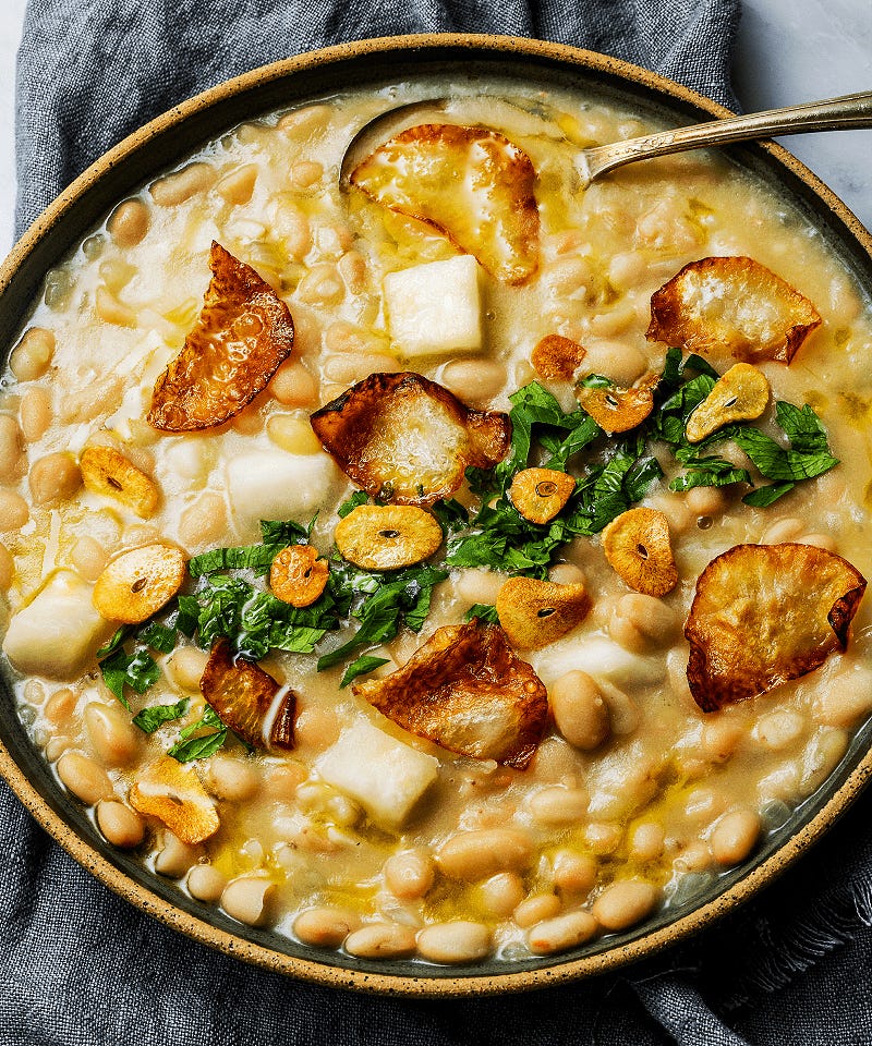 Two mashed Yukon gold potatoes create the most luxurious broth in this vegan beans and turnips recipe.